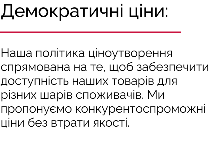 Наша фірма визначається зобов'язанням задовольняти потреби широкого спектру клієнтів, на різний гаманець , шляхом надання високоякісної продукції за доступними цінами.